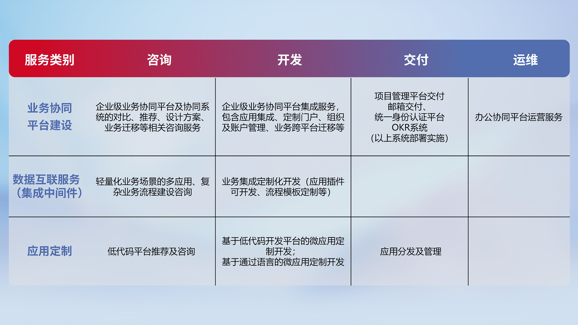针对钉钉、、、企微、、IDaas等平台级产品提供产品的规划、、方案、、交付、、、定制化开发等服务,,,实现如统一协同办公、、、、智能客户服务、、、、混合会议管理、、、智能数据查询、、、等业务场景,,,,实现数字化转型。。。。